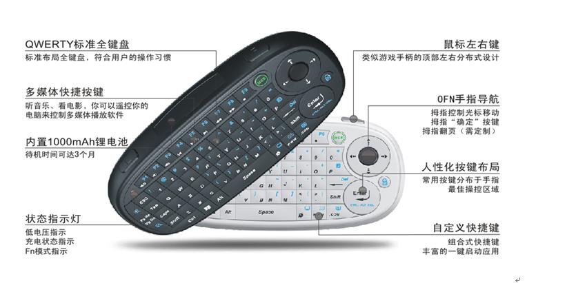 感谢您选用本公司最新研制的手持键盘,本机采用美国安捷伦公司最先进OFN芯片,优质的集成电路和可靠的产品制作工艺。采用2.4G/蓝牙无线传输方式,无延迟,外观新颖,功能强大,可靠性高,是您明智的选择。本机各项性能指标符合国家标准,符合全球通用的FCC,CE行业标准,请放心使用。为了更好的使用其卓越功能,使用前请详细阅读本说明书。